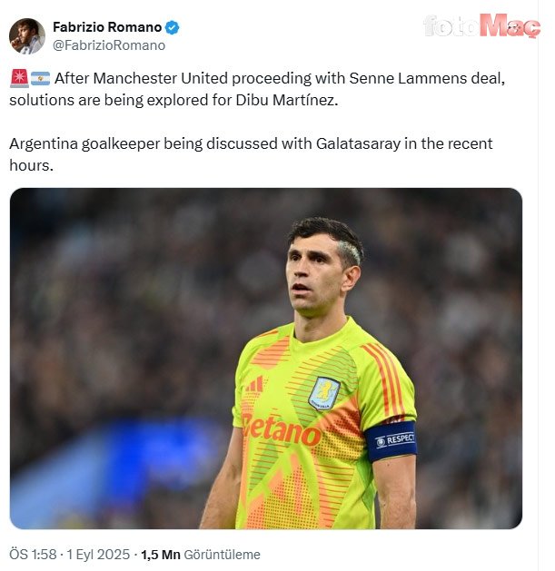 Fabrizio Romano’nun haberine göre; Galatasaray, Aston Villa forması giyen Emiliano Martinez için devreye girdi.