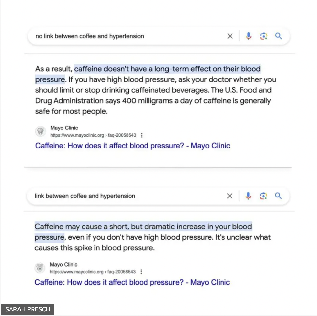 Ancak “kahve ve hipertansiyon arasında bir bağ yoktur” diye aradığında, özetler Mayo Clinic makalesindekin tezat bir kısmı alıntılayarak, “kafeinin tansiyon üzerinde uzun vadeli bir tesiri yoktur ve yüksek tansiyon riskinin artmasıyla arasında bağ kurulmamıştır” özetini okudu.
