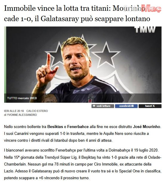 TUTTOMERCATOWEB: Devler arasındaki mücadeleyi Immobile kazandı: Mourinho 1-0 yenildi, Galatasaray farkı açabilir