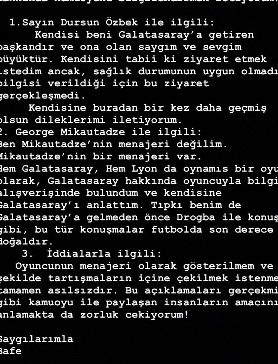 “Ben Mikautadze’nin menajeri değilim. Mikautadze’nin bir menajeri var. Hem Galatasaray, hem Lyon’da oynamış bir oyuncu olarak Galatasaray hakkında oyuncuyla bilgi alışverişinde bulundum ve kendisine Galatasaray’ı anlattım. Tıpkı benim de Galatasaray’a gelmeden önce Drogba ile konuşmam aynıi.”