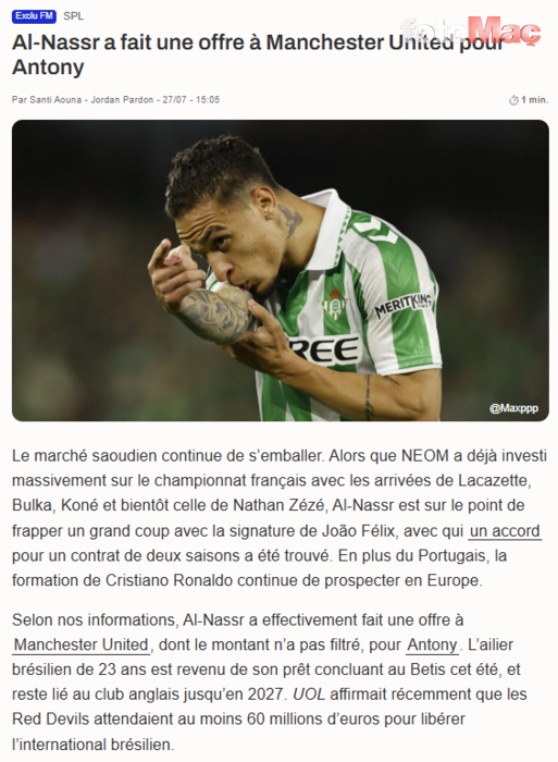 fotomac.com.tr editörü Ömer Çağrı Akdere’nin Foot Mercato’dan derlediği habere göre; Suudi Arabistan Pro Lig ekibi Al-Nassr, sambacı kanat için teklif sundu.