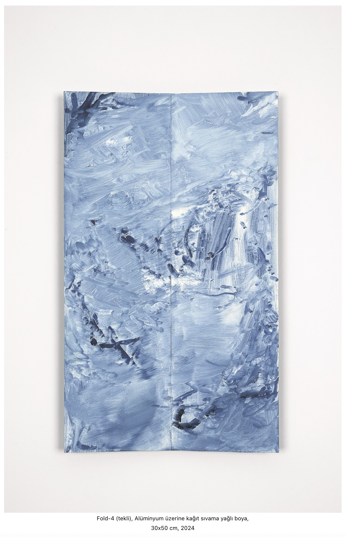 Sergide toplam 14 eser var. Bunlar ekseriyetle 90×100 cm boyutlarında tuvaller, ortada bir iki adet daha büyük olanı da mevcut. Tuvallerin doğal görünümünü korumak için transparan bir astar kullandım. Fotoğraflarda ultramarin mavisini temel alarak kahverengi ve beyaz toz pigment kullandım. Ek olarak, 30×50 cm büyüklüğünde ve 160 derece ortadan dikey bir şekilde bükülmüş alüminyum plakalar üzerine kağıt sıvama ve yağlı boya uyguladığım ‘folds’ yani ‘katlamalar’ olarak isimlendirdiğim bir serinin devamı da var. Bu katlamalar, duvara asıldığında açık bir kitap görünüyor ve üzerine yansıyan ışığı bölüyor, ismi üstünde katlıyor, bir boyutsallık katıyor. Tuvallerde sorduğum birtakım sorular için potansiyel karşılıklar veriyor gibi.