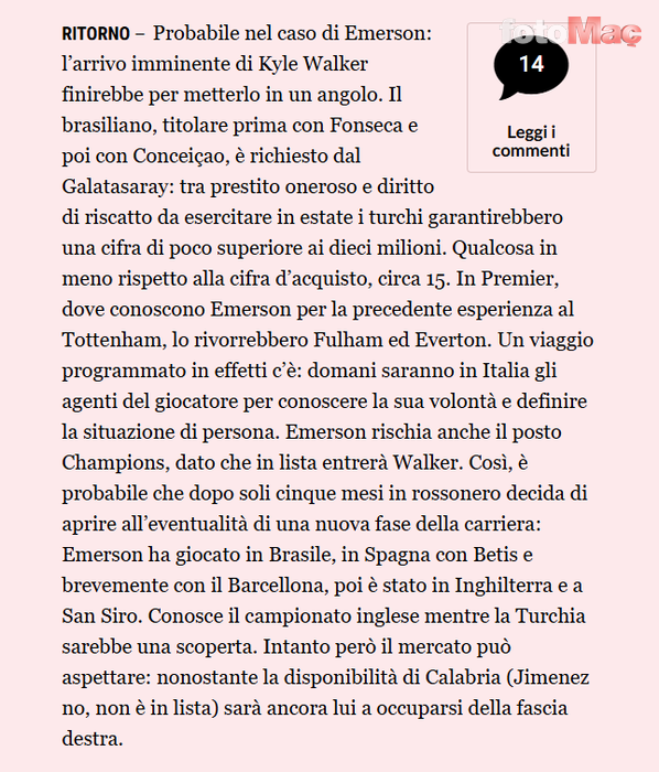 Her iki kulüp de Emerson Royal için nabız yoklarken oyuncunun mesleğine Milan’da devam etme yönünde bir eğilimi olduğu belirtiliyor.