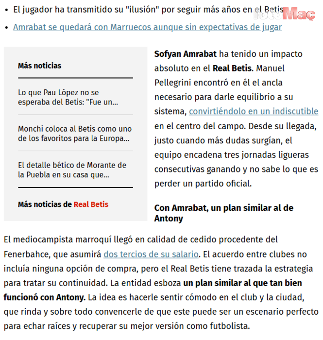 Haberde, Real Betis’in Amrabat’ı Fenerbahçe’den kiraladığı, maaşının üçte ikisinin Türk ekibi tarafından ödendiği ve kiralık sözleşmede satın alma opsiyonunun bulunmadığı hatırlatıldı. Ancak yeşil-beyazlıların sezon sonunda Faslı oyuncuyu bonservisiyle kadrosuna katmak istediği belirtildi.
