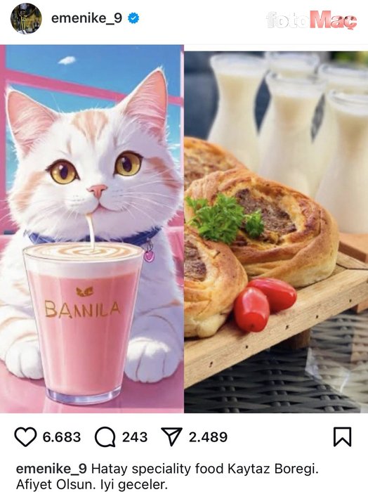 Emenike sosyal medyadan yaptığı paylaşımda, “Hatay’ın özel yemeği Kaytaz Böreği. Afiyet olsun. İyi geceler.” notunu düştü.
