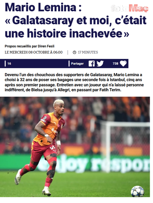 Galatasaray’ın yıldız isimlerinden Mario Lemina, Fransız basınına röportaj verdi. Sarı-kırmızılı ekipte 2019-2020 sezonunda oynamasının ardından geçen sezonun devre arasında geri dönen 32 yaşındaki isim, Galatasaray’daki 2 ayrı dönemine dair dikkat çeken ifadeler kullandı.