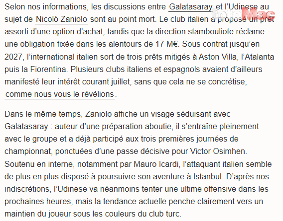 Fransız basınından Foot Mercato’nun haberine göre, Galatasaray ve Udinese arasında Zaniolo’nun transferi konusunda yapılan temaslarda bir ilerleme sağlanamadı.