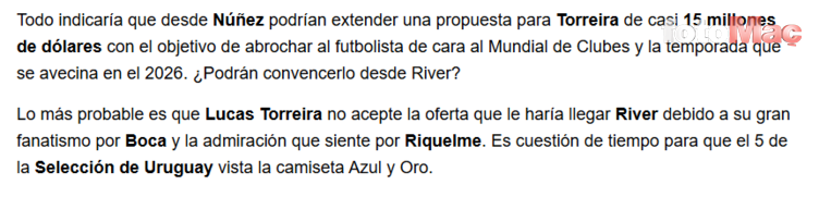 Arjantin basınından El Crack Deportivo’da yer alan habere göre River Plate, Galatasaray’a Torreira için 15 milyon dolarlık bir teklif sunmaya hazırlanıyor.