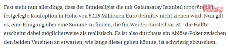 Alman basınından Kicker’ın haberine göre Werder Bremen, Galatasaray ile yapılan kiralık anlaşmada yer alan 5 milyon 125 bin Euro’luk satın alma opsiyonunu kullanmayacak.