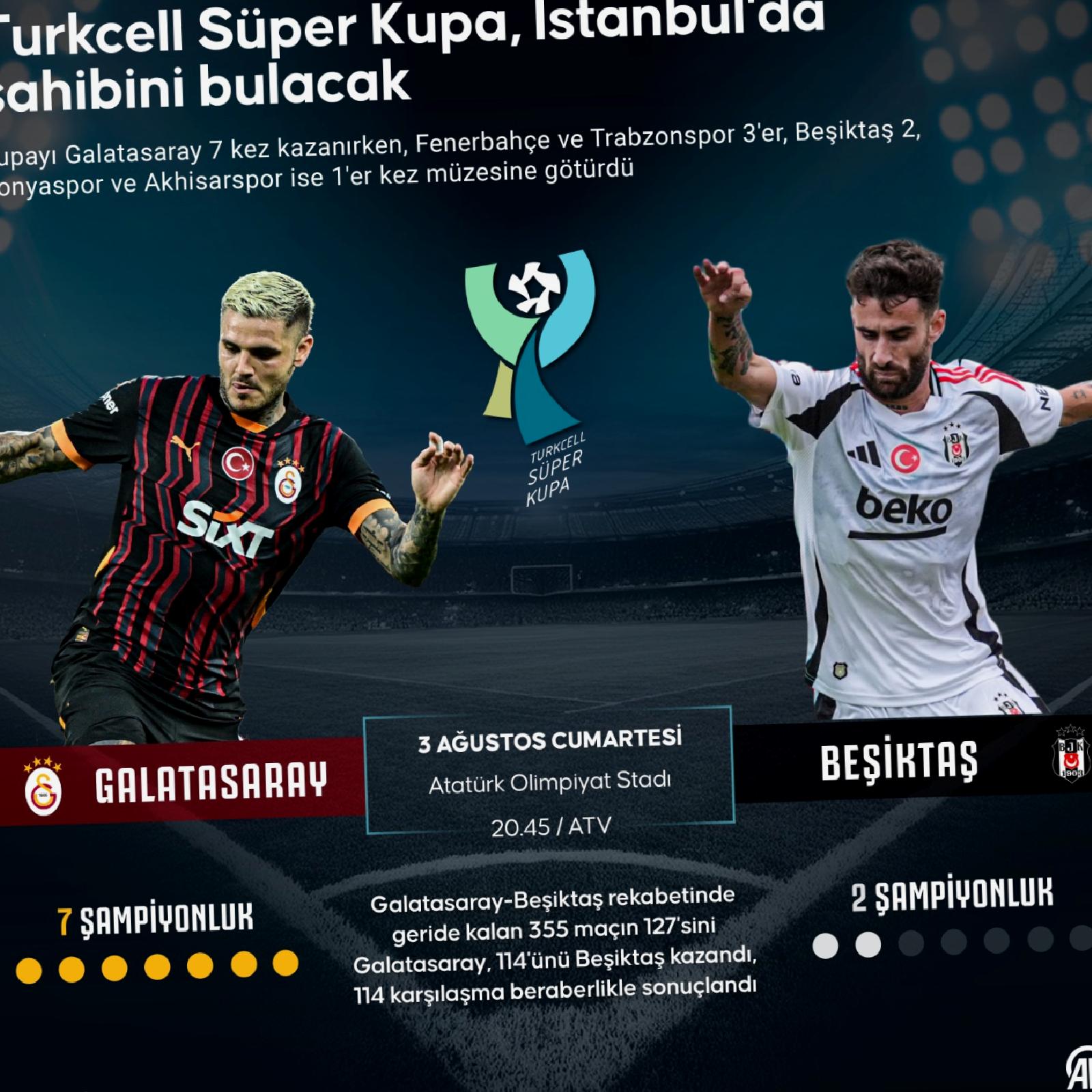 2023-2024 Süper Lig dönemini şampiyon tamamlayan Galatasaray ve Ziraat Türkiye Kupası’nı müzesine götüren Beşiktaş bugün Süper Kupa maçında karşı karşıya gelecek. Atatürk Olimpiyat Stadı’nda oynanacak mücadele saat 20.45’te başlayacak. Mücadele ATV ekranlarından canlı olarak yayınlanacak. Müsabakada hakem Atilla Karaoğlan düdük çalacak.