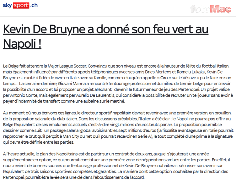Sky Sports’un haberine göre Serie A’nın iddialı ekiplerinden Napoli, De Bruyne’yi renklerine bağlamak adına somut adımlar atmış durumda.