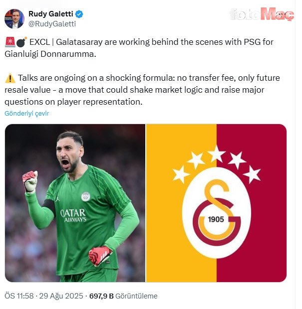 Rudy Galetti’nin haberine göre; Cimbom, Gianluigi Donnarumma transferi için PSG ile perde arkasında çalışmalar yürütüyor.