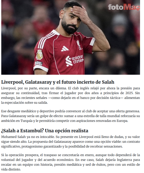 SALAH İÇİN RESMİ TEKLİF HAZIRLANIYOR Fichajes’te yer alan habere göre Galatasaray, Liverpool’dan ayrılmaya hazırlanan Mohamed Salah’ın durumunu yakından takip ediyor. Sarı-kırmızılıların, Mısırlı yıldız ayrılık kararını netleştirdiğinde devreye girerek tarihi bir sözleşme teklifini resmileştireceği ifade edildi.