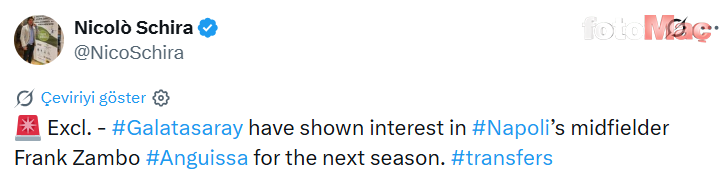 İŞTE O İSİM! İtalyan gazeteci Nicolo Schira’nın haberine göre Galatasaray, gelecek sezon için Napoli’nin orta saha oyuncusu Frank Zambo Anguissa’ya ilgi gösterdi.