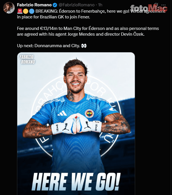 Ünlü gazeteci Fabrizio Romano’nun aktardığı bilgilere göre Fenerbahçe, Ederson için Manchester City’ye 13-14 milyon euro bonservis ödeyecek.