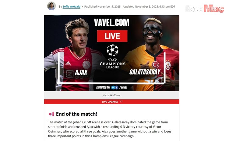 Galatasaray, Johan Cruyff Arena’da domine ettiği Ajax’ı 3-0’lık skorla ezdi, geçti. (Vavel)