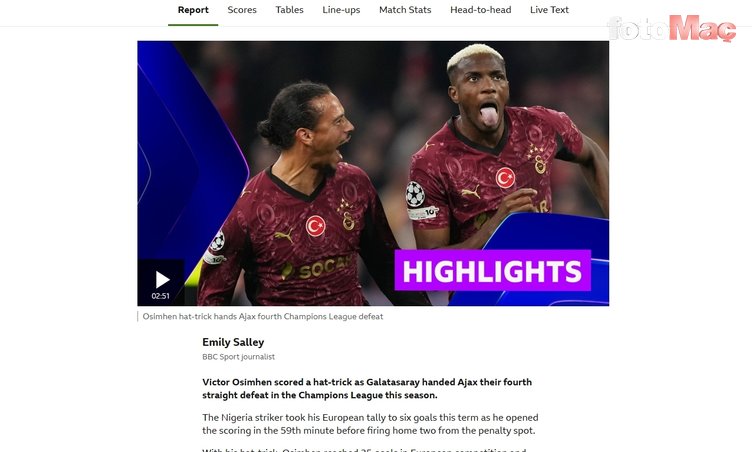 Osimhen hat-trick yaptı, Galatasaray deplasmanda Ajax’a bu sezon Şampiyonlar Ligi’ndeki art arda 4. hezimetini yaşattı. (BBC Sport)
