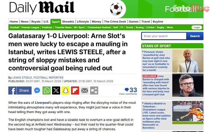 Arne Slot’un talebeleri İstanbul’da hırpalanmaktan zor kurtuldu. (Daily Mail)