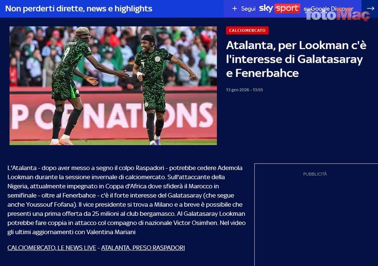 25 MİLYON EURO ÖNERİLECEK SKY Italia’nın haberine göre; Galatasaray, Ademola Lookman transferi için Atalanta’ya 25 milyon Euro teklif edecek.