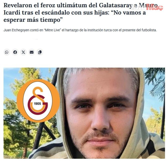 FESİH İDDİASI Arjantin basınından gazeteci Juan Etchegoyen, Galatasaray’ın, Mauro Icardi’ye artık Türkiye’ye gelmesi yönünde uyarı verdiğini ve birkaç gün içinde İstanbul’a dönmemesi durumunda yıldız futbolcunun sözleşmesinin feshedebileceğini iddia etti.