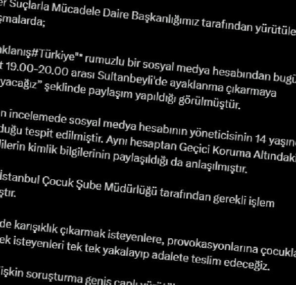 İçişleri Bakanlığı, sosyal medyada İstanbul Sultanbeyli’de “ayaklanma” daveti yapan hesabın 14 yaşındaki bir çocuk tarafından kullanıldığını açıkladı. Bakanlık, olayla ilgili ayrıntıları kamuoyu ile paylaştı.