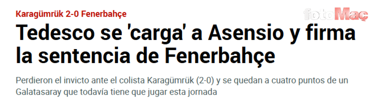 “Lider Galatasaray ile aradaki fark dört puana çıktı ve sarı-kırmızılıların RAMS Başakşehir ile oynayacağı maç da düşünüldüğünde, ligin bitimine sekiz hafta kala bu fark şimdiden aşılması zor görünüyor. Tedesco, Asensio’yu yedek bırakarak Fenerbahçe’nin adeta mezarını kazdı. Sarı-lacivertliler yakın zamanda UEFA Avrupa Ligi play-off’larında da, Asensio yine yedekken, elenmişti.”