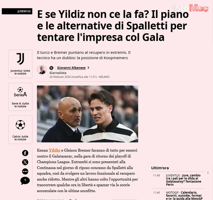 Son dakika Galatasaray haberleri: UEFA Şampiyonlar Ligi son 16 play-off turu ilk maçında temsilcimiz Galatasaray’a 5-2 yenilen Juventus, çarşamba günü rövanş maçında sarı-kırmızılıları konuk edecek. İtalyan devinde kritik karşılaşma öncesi milli futbolcu Kenan Yıldız ile ilgili flaş gelişmeler yaşanıyor. İşte detaylar… (fotomac.com.tr/DIŞ HABERLER)
