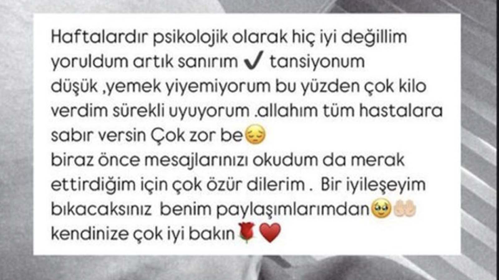 “Haftalardır ruhsal olarak hiç iyi değilim, yoruldum artık sanıyorum. Tansiyonum düşük, yemek yiyemiyorum, bu yüzden çok kilo verdim. Daima uyuyorum. Allah’ım tüm hastalara sabır versin, çok zor. Biraz önce iletilerinizi okudum, merak ettirdiğim için çok özür dilerim. Bir güzelleşeyim, bıkacaksınız benim paylaşımlarımdan. Kendinize çok iyi bakın.”