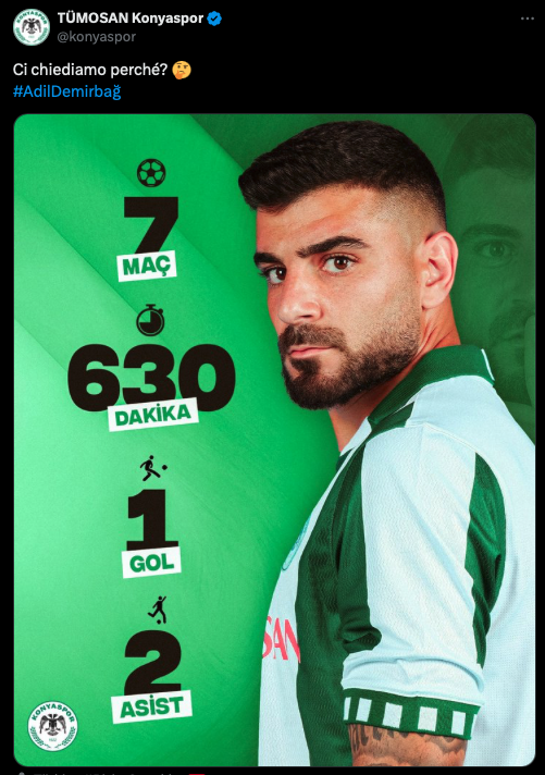 Konyaspor, Adil Demirbağ’ın A Milli Kadro’nun aday takımına çağrılmamasına tepki gösterdi. Konyaspor’dan yapılan açıklamada, Vincenzo Montella’ya gönderme yapılarak İtalyanca, “Nedenini merak ediyoruz?” sözleri kullanıldı.