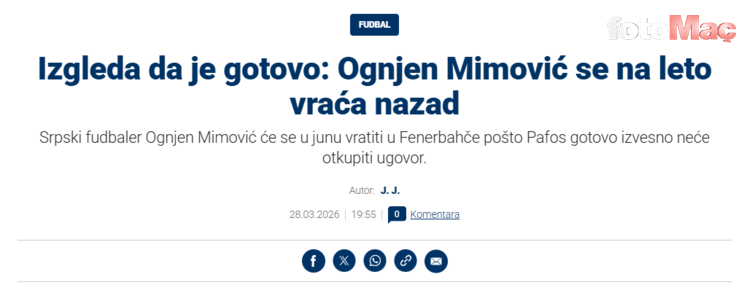 Sırp basınından Sportinjo’da yer alan habere göre, Pafos’un Mimovic’in 6 milyon euroluk satın alma opsiyonunu kullanmama kararı aldığı öğrenildi.