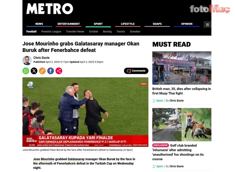 Mourinho’dan tartışma yaratacak hareket! 2-1 yenildikleri kupa maçı sonrası rakip hoca Okan Buruk’un burnunu sıktı, Buruk da bir futbolcu gibi yüzünü tutarak kendini yere bıraktı. (A Bola)