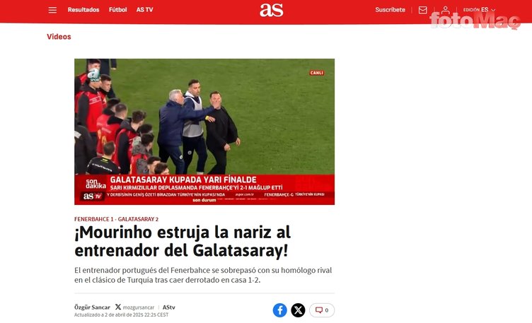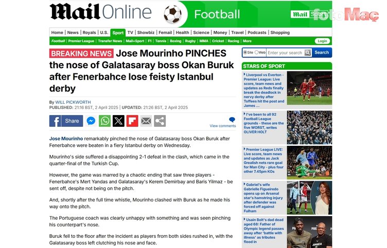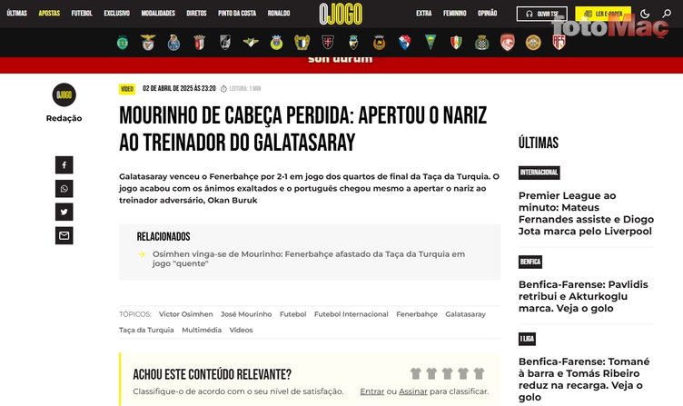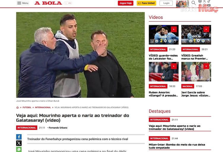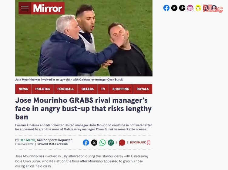 Mourinho aklını kaybetti: Portekizli hoca Türkiye Kupası’nda aldıkları 2-1’lik yenilgi sonrası Galatasaray Teknik Yöneticisi Okan Buruk’un burnunu sıktı. (O Jogo)