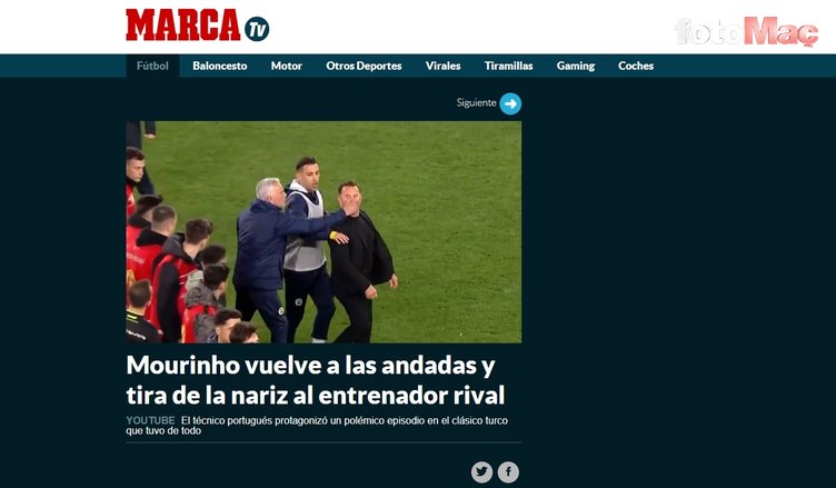 Her şeye sahne olan İstanbul derbisinin bitiminde Mourinho rakip takım hocasına tartışmalı bir müdahalede bulundu ve burnunu sıktı. (Marca)