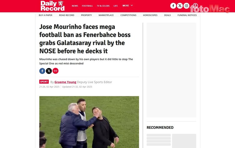 Jose Mourinho, rakibi Galatasaray’ın hocasının burnunu çekti ve şu anda devasa bir men cezası ile karşı karşıya. (Daily Record)