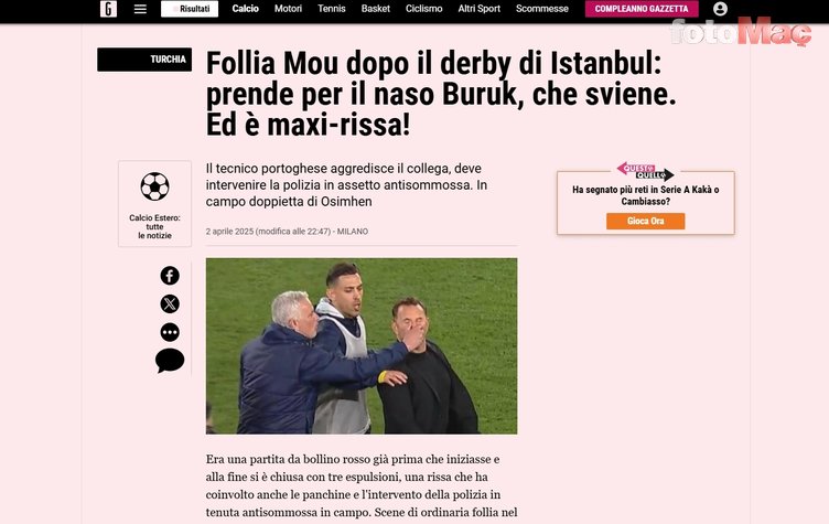 Ateşli geçen ve polisin de müdahalede bulunmak zorunda kaldığı İstanbul derbisi sonrası Portekizli çalıştırıcı rakip hocanın yüzüne müdahalede bulundu. (La Gazzetta dello Sport)