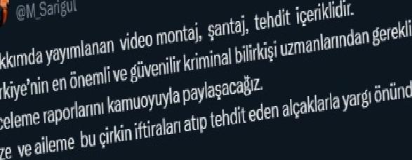 “Hakkımda yayımlanan video montaj, şantaj, tehdit içeriklidir. Türkiye’nin en çok önemli ve sağlam kriminal eksper uzmanlarından gerekli inceleme raporlarını kamuoyuyla paylaşacağız. Bize ve aileme bu yakışıksız iftiraları atıp tehdit eden alçaklarla yargı önünde hesaplaşacağız.”