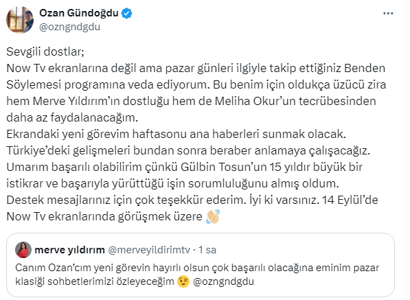 Pazar günleri NOW TV ekranlarında Benden Söylemesi programının sunucusu Ozan Gündoğdu, yaptığı sosyal medya paylaşımıyla Gülbin Tosun’un yerine hafta sonu haberlerini sunacağını açıkladı. Gündoğdu, paylaşımında “Umarım başarılı olabilirim zira Gülbin Tosun’un 15 yıldır büyük bir istikrar ve muvaffakiyetle yürüttüğü işin misyonunu almış oldum” tabirlerine yer verdi.