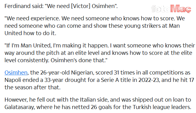aspor.com.tr editörü Enes Arslan’ın İngiliz basınından derlediği haberde Victor Osimhen’in Manchester United için doğru bir isim olduğunun altını çizen Rio Ferdinand, “Ben Man United olsam, bunu gerçekleştiririm. Sahada seçkin düzeyde yolunu bilen ve seçkin düzeyde daima gol atmayı bilen birini istiyorum. Osimhen bunu başardı.” dedi.