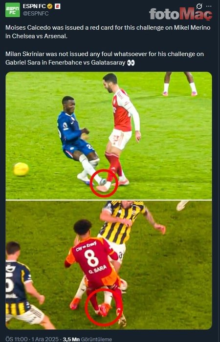 ESPN, Skriniar’ın Sara’ya müdahalesine ‘Moises Caicedo, Chelsea-Arsenal maçında Mikel Merino’ya yaptığı müdahale nedeniyle kırmızı kart gördü. Milan Skriniar, Fenerbahçe-Galatasaray maçında Gabriel Sara’ya yaptığı müdahale nedeniyle herhangi bir faul almadı.’ ifadeleriyle ver verdi.