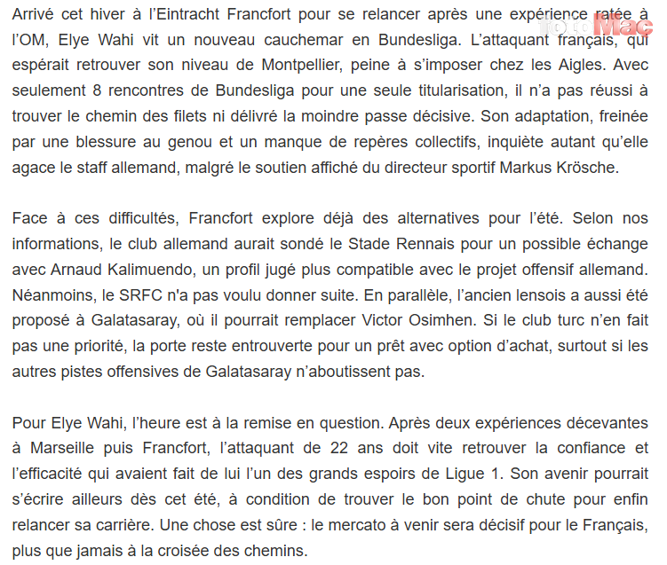 Bu sezonun başında 27 milyon Euro bedelle Lens’ten Marsilya’ya transfer olan Wahi, beklentilerin uzağında kalmış ve devre arasında 26 milyon Euro bonservisle Eintracht Frankfurt’un yolunu tutmuştu.