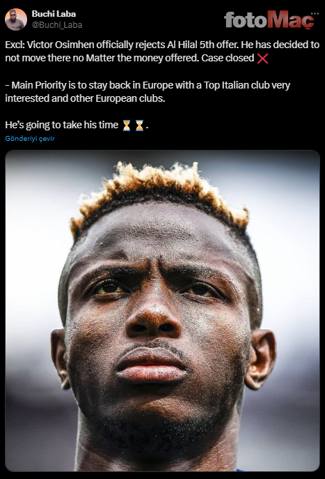 Osimhen’in yakın arkadaşı Buchi Laba’nın sosyal medya hesabından yaptığı paylaşıma göre yıldız isim Al-Hilal’in 5. teklifini resmen reddetti.