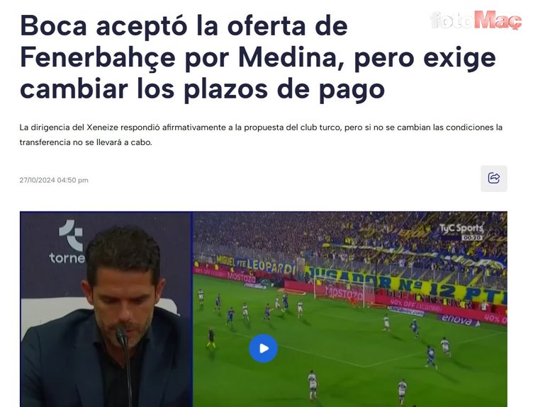 Aspor.com.tr editörlerinden Kubilay Açıkgün’ün, Tycsports’tan derlediği, Medina ile ilgili yapılan haberde; Boca Juniors’ın, Fenerbahçe’nin ödeme planında değişikliğe gitmesi halinde sarı lacivertlilerin teklifini kabul edeceği belirtildi.