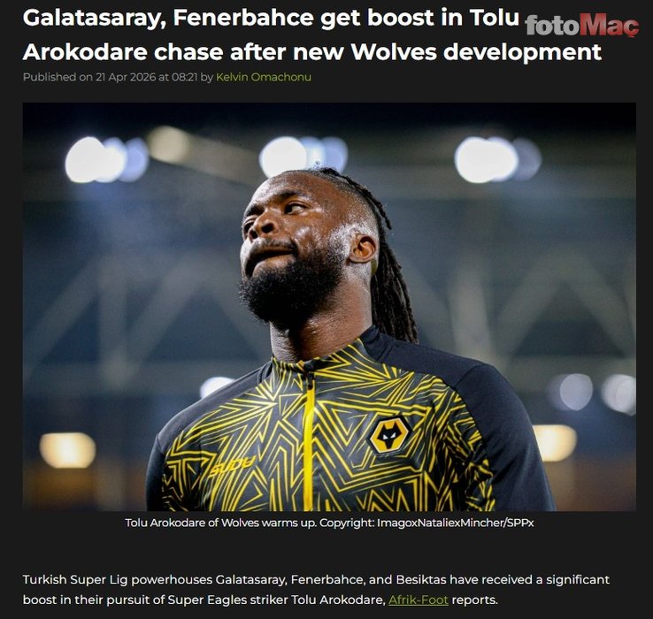 Afrik-Foot’ta yer alan habere göre; Beşiktaş, Fenerbahçe ve Galatasaray, Wolverhampton forması giyen Nijeryalı forvet Tolu Arokodare ile ilgileniyor.