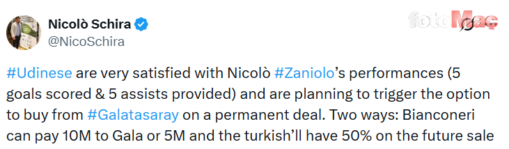 Schira, haberinin devamında Udinese’nin Zaniolo’nun bonservisini almak için ya 10 milyon euro bonservis ödeyeceğini ya da 5 milyon euro ödeyeceğini ancak bu ihtimalde de Galatasaray’ın Zaniolo’nun sonraki satışından %50 pay alacağını vurguladı.